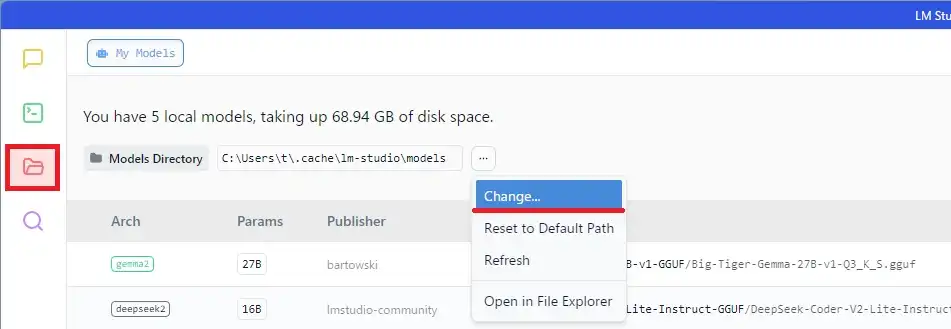 デフォルトだとCドライブにモデルのデータが入ってしまいます。 別ドライブに動かしたい方は、以下画像赤枠のフォルダマークからモデルデータ一覧を開き、保存先の変更を行ってください。