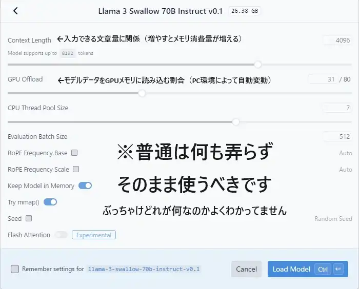 モデルを読み込んだままの状態で切り替えを試みると、GPUオフロードの数値がおかしくなることがあります。 手動で戻せば問題ないとは思うのですが、念のためこうしています。