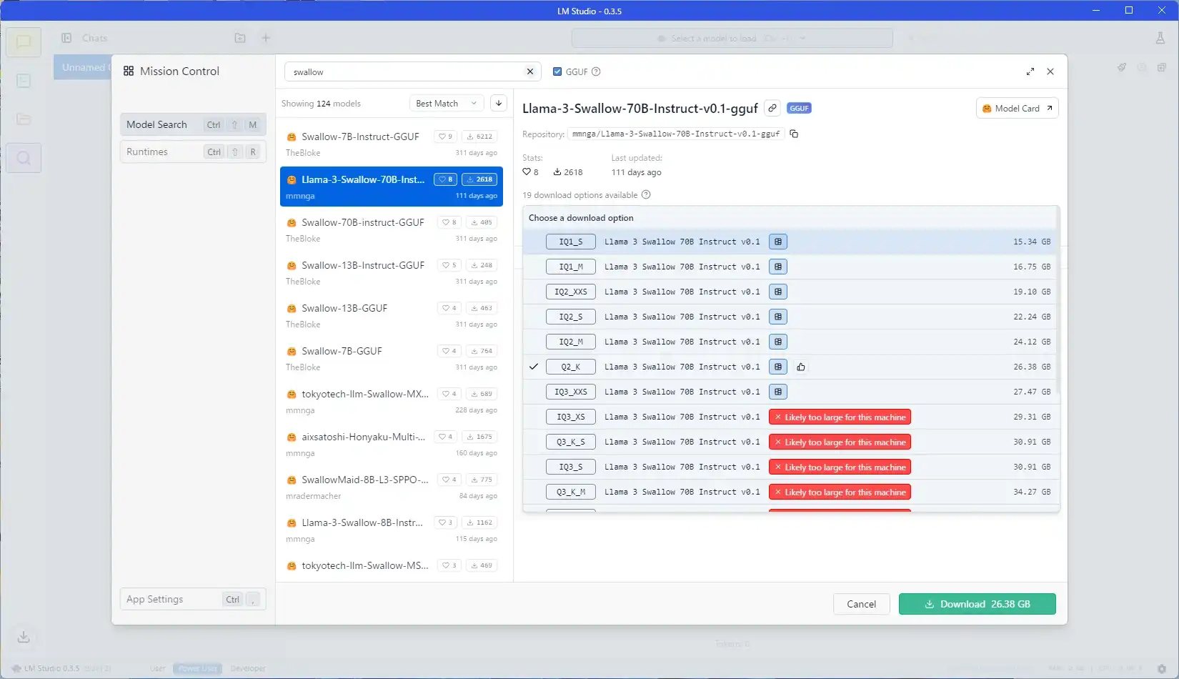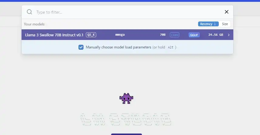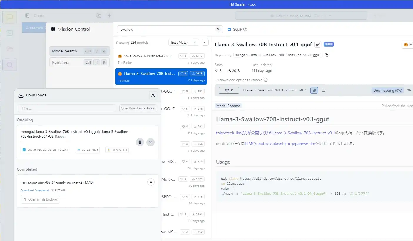 今回の説明ではLlama 3 Swallow 70B Instruct v0.1のQ2_Kをダウンロードしています。