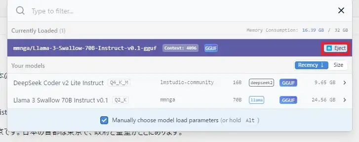今使っているモデルから別のものに切り替える際は、以下画像赤枠のEjectを押して、先にメモリを解放したほうがいいかもしれません。