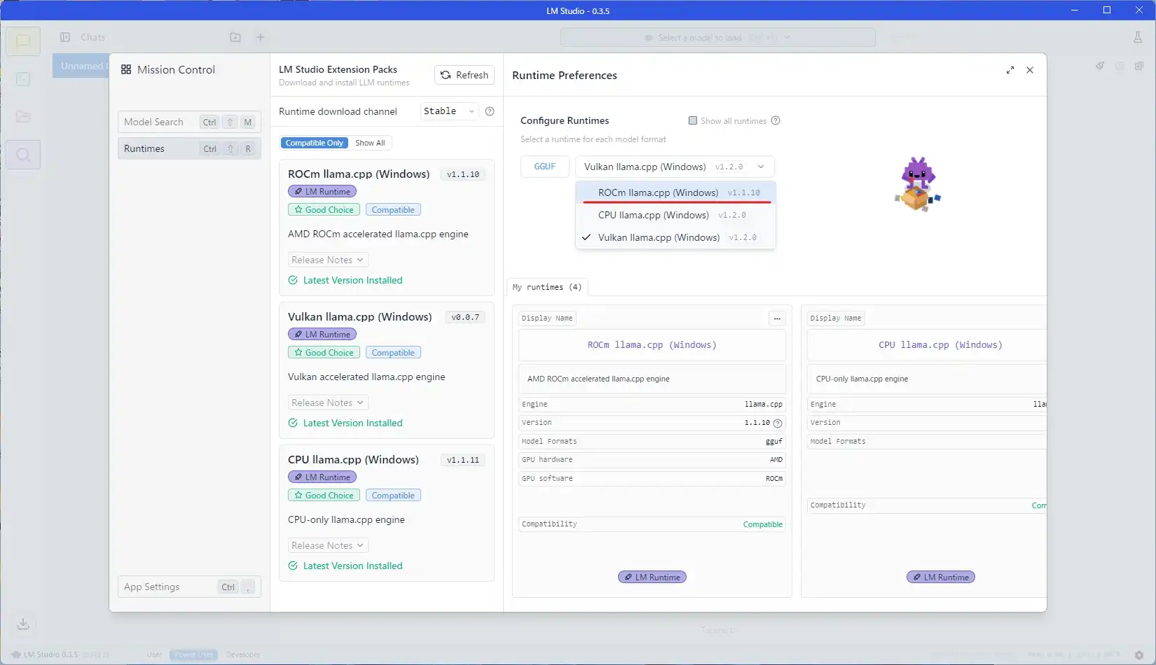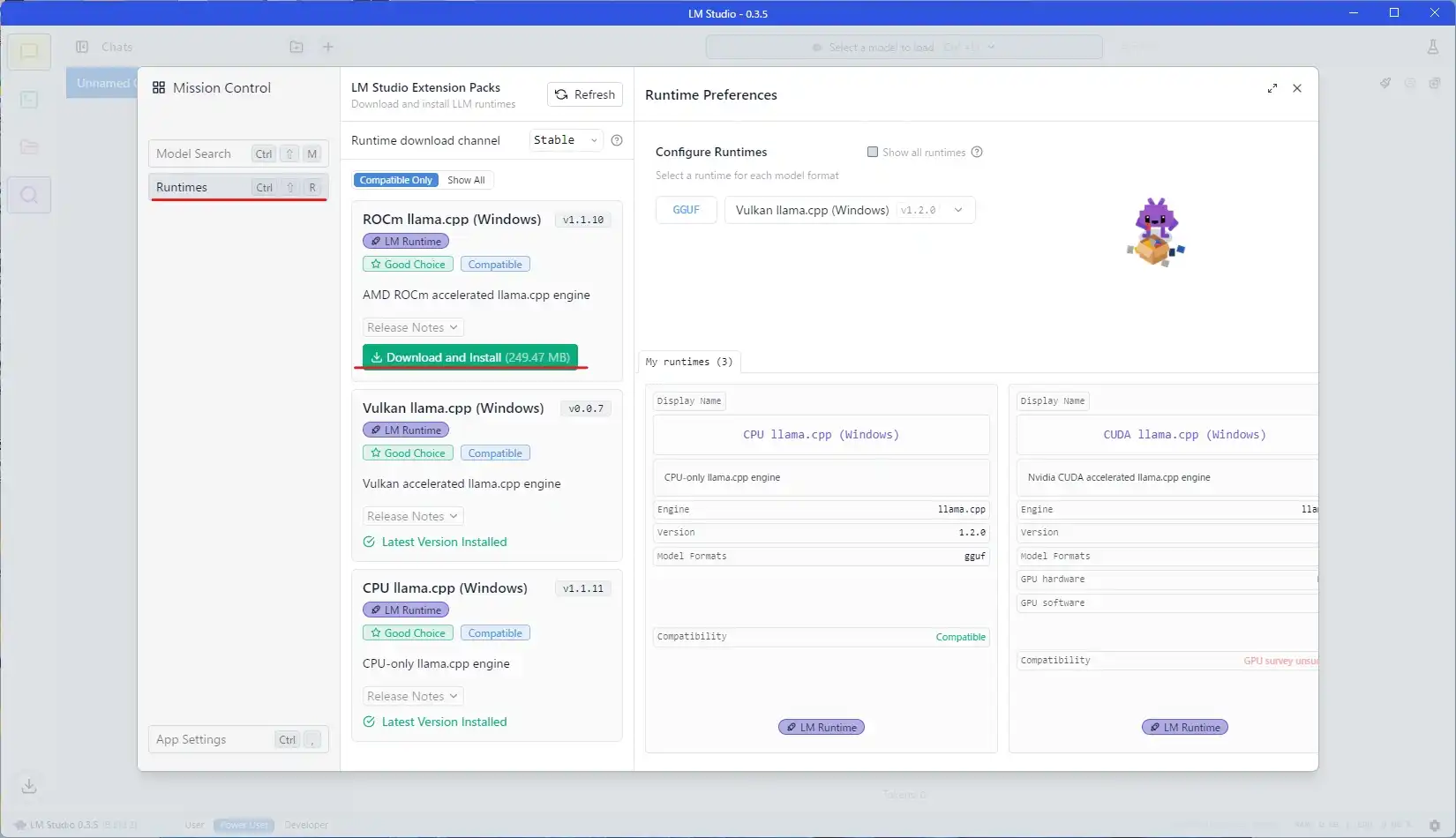 左側にあるRuntimesをクリックすると、対応環境ならROCm llama.cpp (Windows)というのが表示されているはずです。