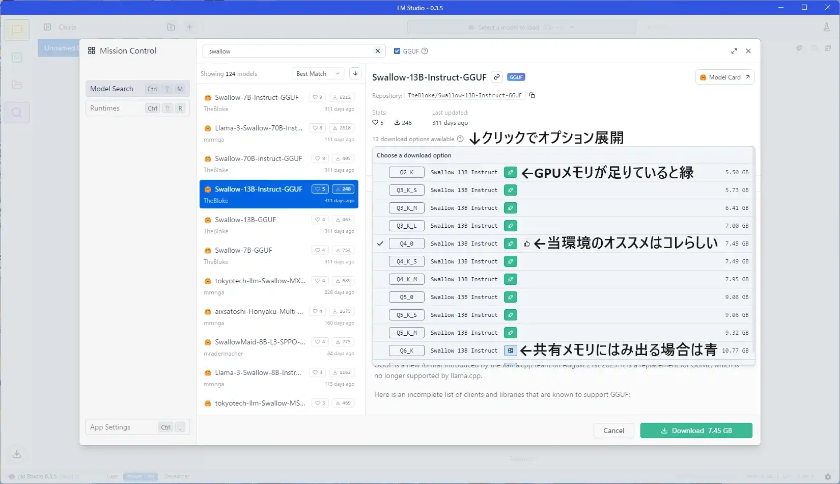上部検索窓に導入したいデータの名前を入れると、内容を絞り込めます。 とりあえず日本語対応らしいSwallowを検索し、13Bモデルをクリック。