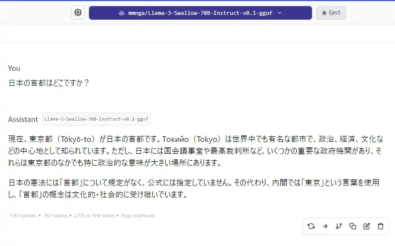 Load ModelクリックかCtrl+Enterで読み込んだら、ついに利用可能になります。 試しに日本の首都を聞いてみました。