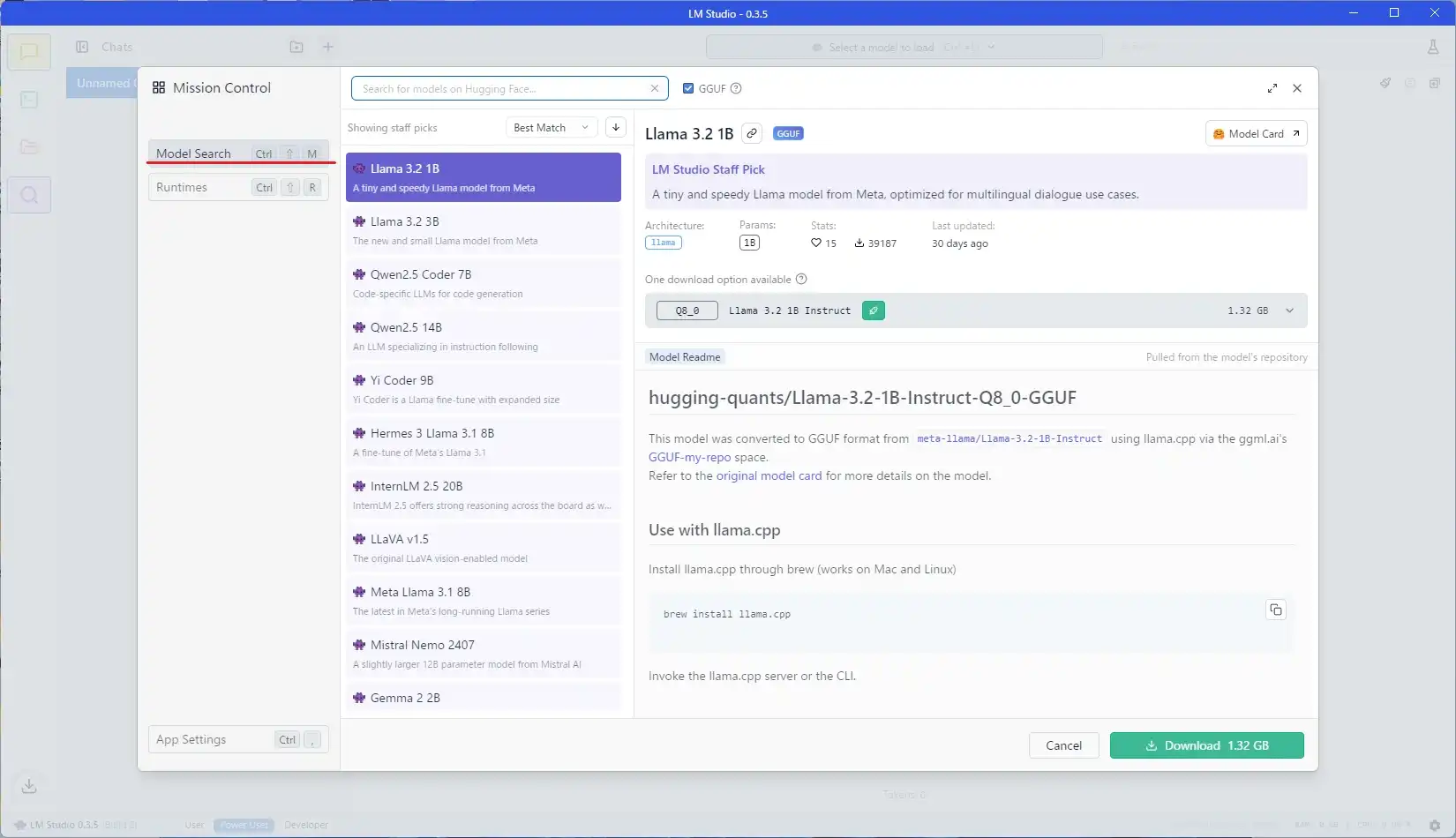 次にモデルデータをダウンロードします。 LM Studioを通して保存することができるのですが、LLM初心者の場合は非常に参考になるUIとなっています。