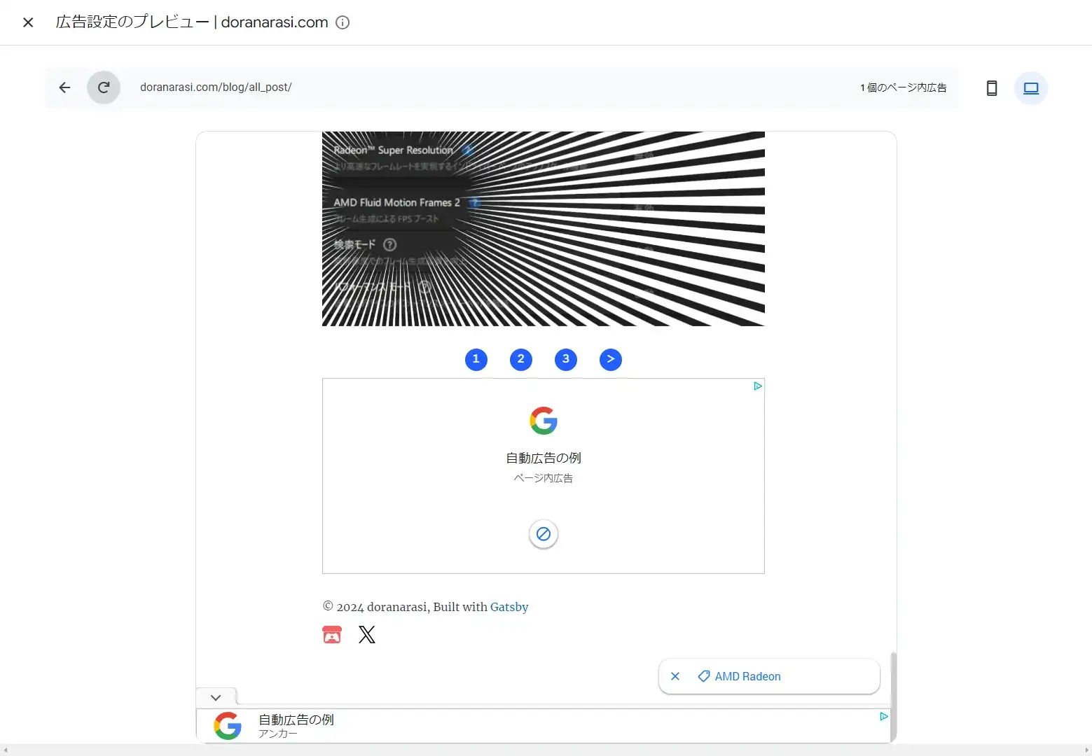 自動広告全般の表示はできるようになりましたが、それでもメインがJavascript故か、設定どおりの自動表示は難しいようです。なんなら素材配布ページのほうは自動表示できてません。多分ページのつくりの問題です。
